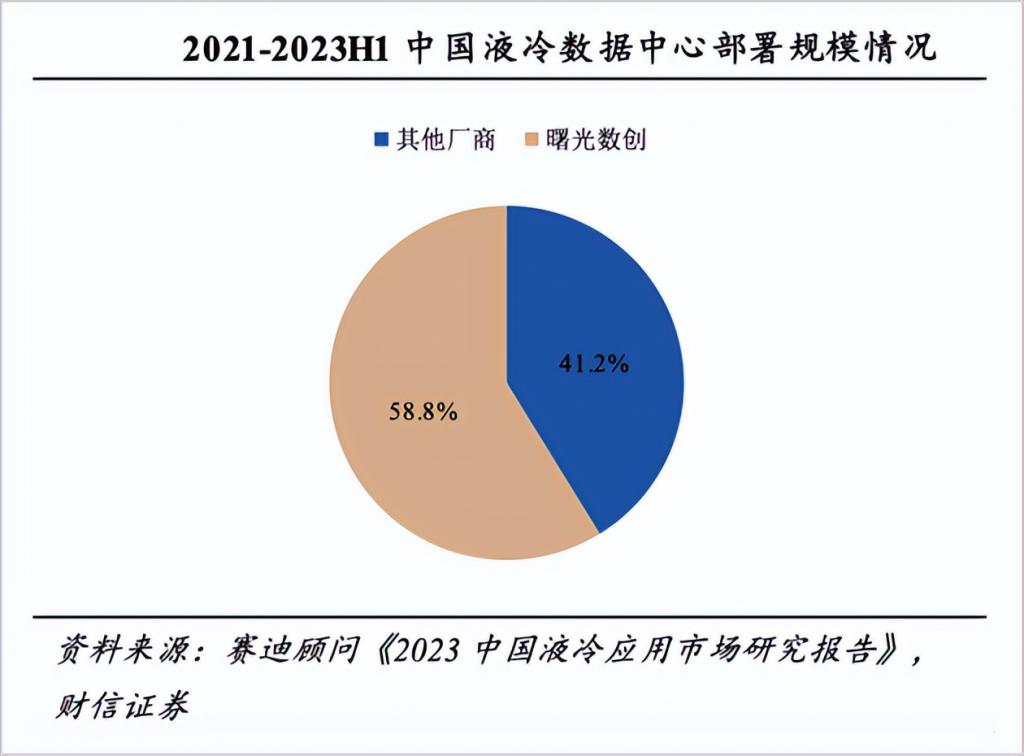 曙光系企业曙光数创是浸没相变液冷领域的 " 小巨人 " 企业,公司在 2021 年至 2023 上半年以 58.8% 的市场份额位居国内液冷数据中心基础设施市场第一名,并承担了国家级重大科研装置项目。