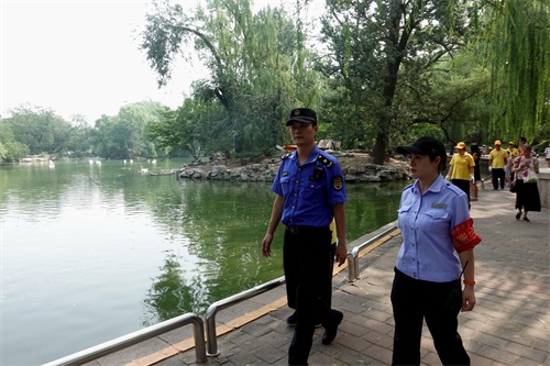 北京动物园管理队会同展览路街道城管执法队开展联合巡视执法,重点对园内不文明游园行为进行巡视