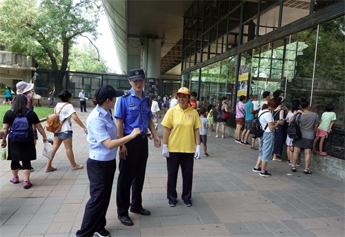 为引导游客文明有序游园,北京动物园联合属地城管、驻园派出所、首都公共文明引导员等多方力量,开展综合治理,全面劝阻投喂动物等不文明游园行为。