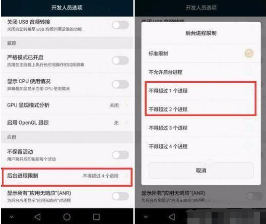 此外,还可以通过优化设置后台进程的数量来节省手机本身的内存消耗,以此来提升可用内存空间的大小。