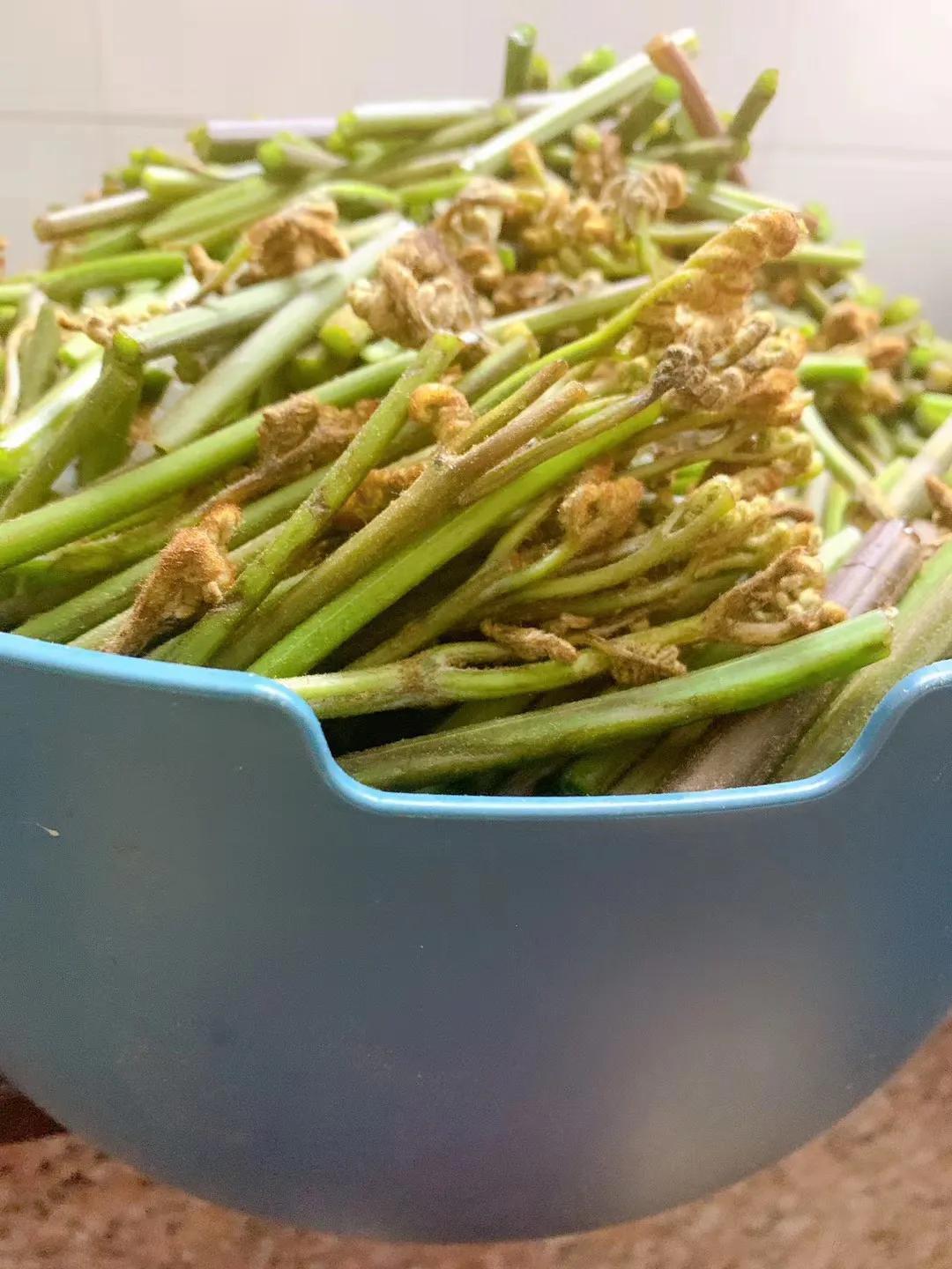 又是一种蕨菜,它的芽稍盘曲似蚊香,刚刚采下来裹着毛茸茸的一层绒毛,先烫煮后把绒毛捋去,再用清水漂一天,去除涩味