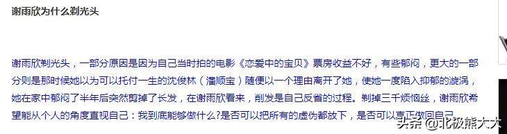 有段时间,谢雨欣剃了光头,外界纷纷猜测,该不会她看破红尘要出家吧?