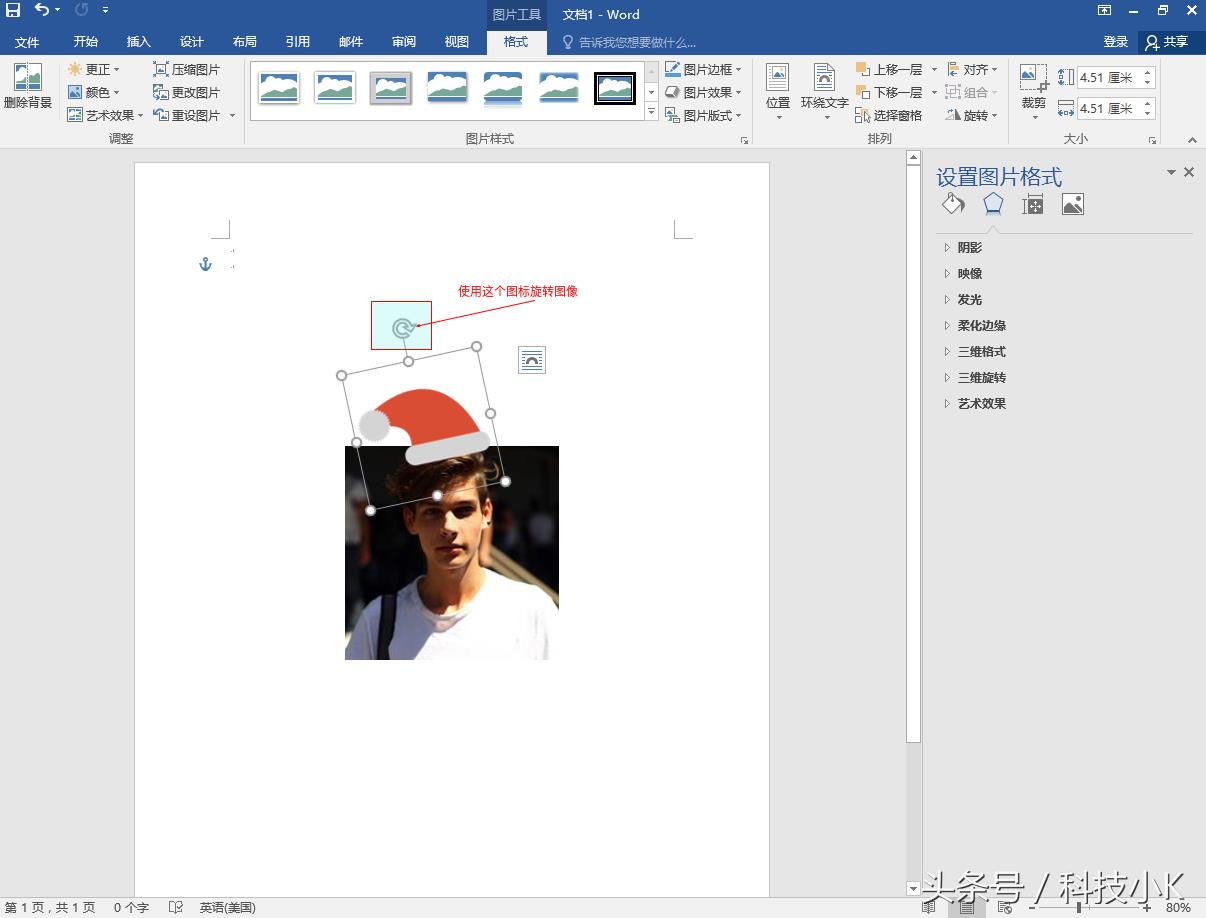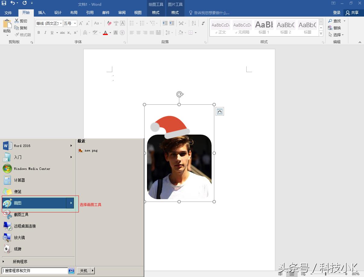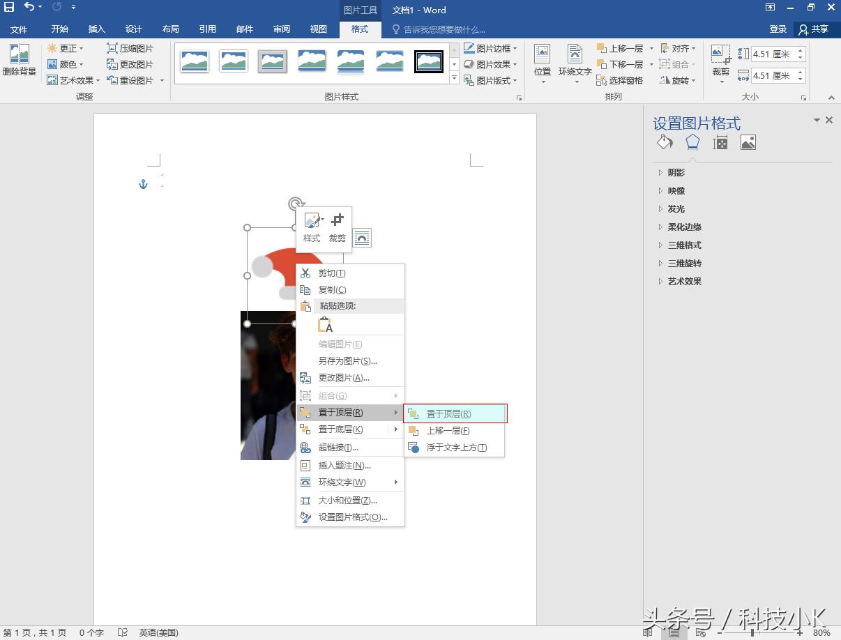 选择插入的圣诞图片,右键-->环绕文字-->浮于文字上方-->拖动圣诞照片到头像照片上方合适位置,右键-->置于顶层-->置于顶层