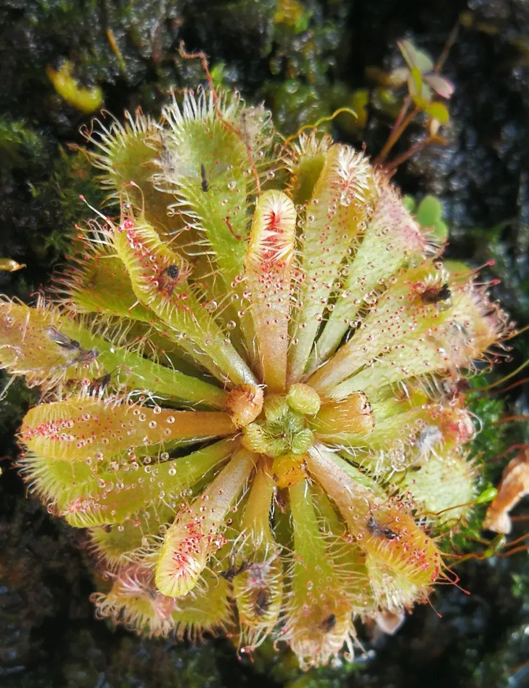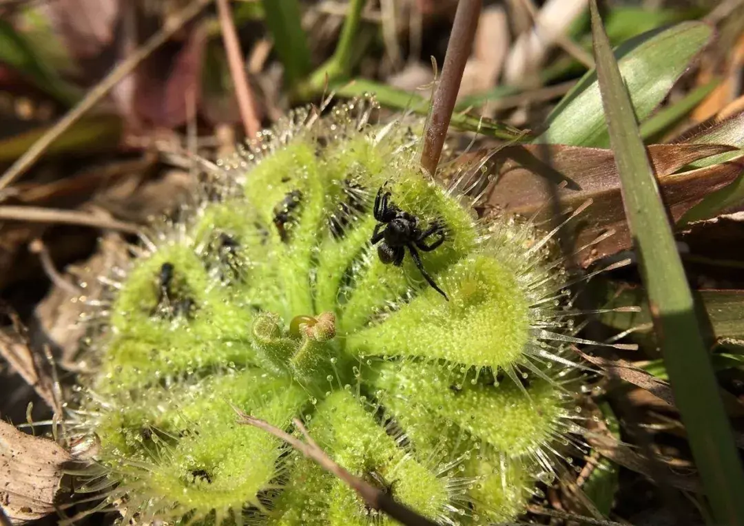 1、茅膏菜会分泌一种粘液,这种粘液含有诱导素,可以将虫子吸引过来,等虫子爬上来后,叶片会卷起来,将虫子困在里面,之后就慢慢消化掉了。
