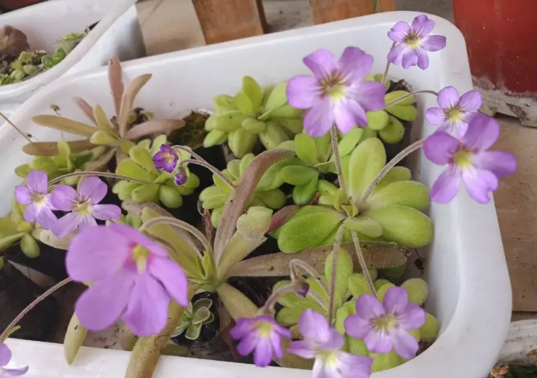 捕虫堇喜欢散射光充足的环境,同时保证环境湿润,但是注意不要让盆内积水,土壤可以选择疏松透气一点的,可以在盆土里掺点沙子或珍珠岩,养得好了它还能开出紫色小花呢!