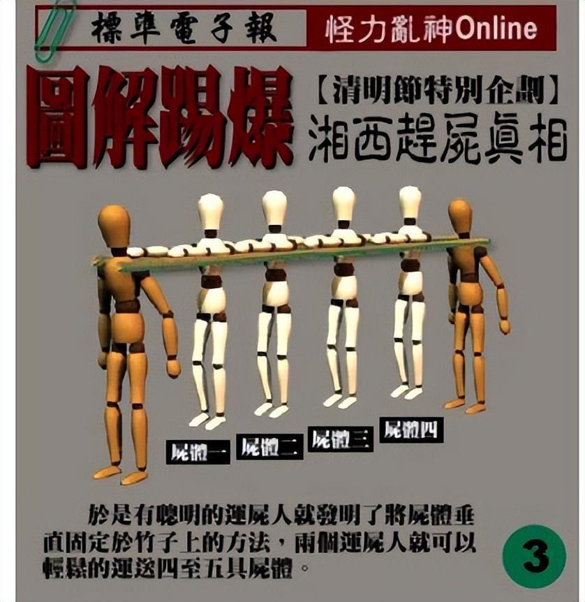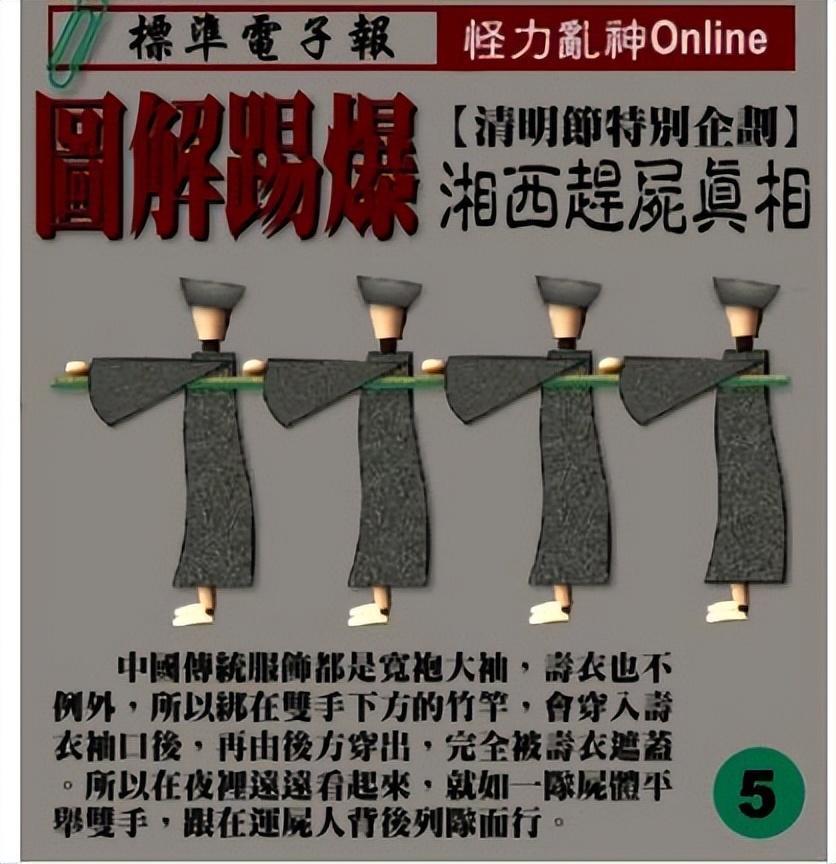 近年来,人们不断解密赶尸现象,出现了不同的说法。2006年,台湾一家刊物发文认为,赶尸人是将竹竿从死者腋下穿过,并将手臂捆绑在竹竿上,尸体穿着宽大的寿衣,遮住了竹竿,而赶尸人则扛着竹竿走。由于竹竿受力后弯曲,带动尸体晃动,在夜里看上去就像是直立的尸体双手平举在跳跃一般。探秘志也费了九牛二虎之力,脱了各种朋友帮我找到了台湾这会学家在刊物上发布的照片,在这组照片中解说了关于湘西赶尸的秘密,我们一起来看看: