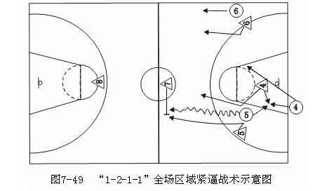 1 .“ 1-2-1 -1”全场区域紧逼战术。这种紧逼战术争夺的侧重点在前场和中场,运用这种形式一般在对方发后场端线或靠近端线的边线球时开始积极争夺,控制对手接球并进行夹击。这种形式攻击性较强,能有效地防止对方从正面直接向篮下进攻,延续进攻速度,但对防守队员要求很高。