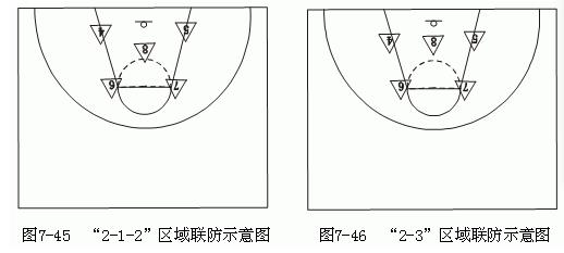 1 .“ 2-1-2”区域联防队形(见图 7-45)。“ 2-1 -2 ” 区域联防的特点是以防内线为主,外围得分手不超过2人时采用。由于位置分布均匀,故机动性较大。
