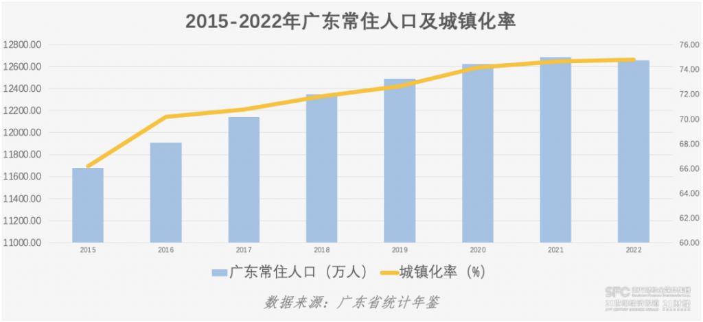 从区域看,广东人口广泛集中珠三角,从 2017 年开始,珠三角人口占全省人口比重达 60.44%,2022 年达到 61.86%。其中,广州、深圳、东莞是目前省内常住人口破千万的城市,达到我国超大城市规模,佛山则是城区常住人口 500 万以上 1000 万以下的特大城市。