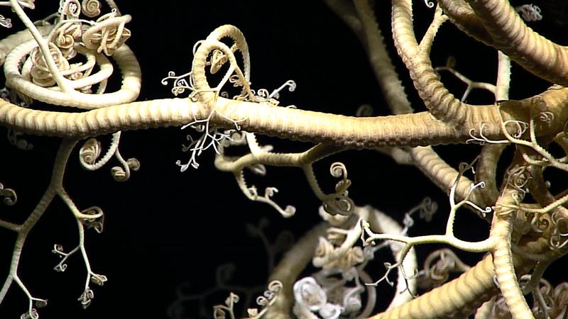 它先从圆盘身体上,长出5根主手臂。接着在每根手臂上一分为二,分出2个分支。分支上继续一分为二,再分出2个分支。手臂越分越细,最末端的分支,像龙爪菜一样卷曲盘绕。最多的时候,一只筐蛇尾能分出5000多个手臂分支。