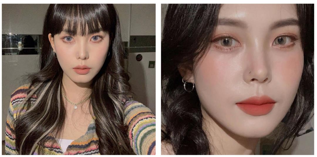 如果选择蓝色美瞳,则需要塑造明确的眉骨与眼眶结构,制造“深邃感”,口红色号最好选择冷色调与瞳孔颜色相呼应。