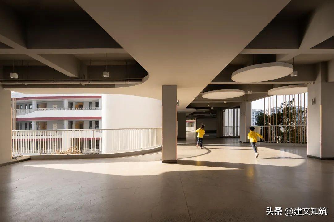 整个校区由中央共享平台分为东西两部分,布局紧凑,东侧为小学部,西侧为初中部,300米运动场位于轴线尽端架空层顶部。设计将现代教育的理念融入设计中,教学空间满足现阶段的教学模式,同时也具备满足未来发展变化的需求,为自由化的艺术活动提供多种可能。