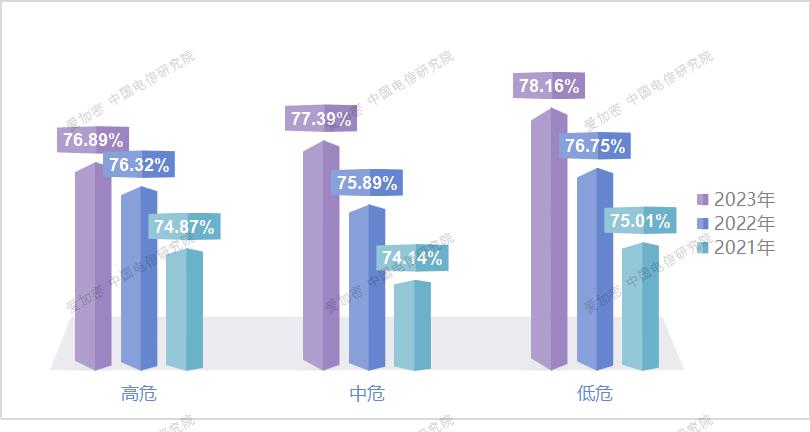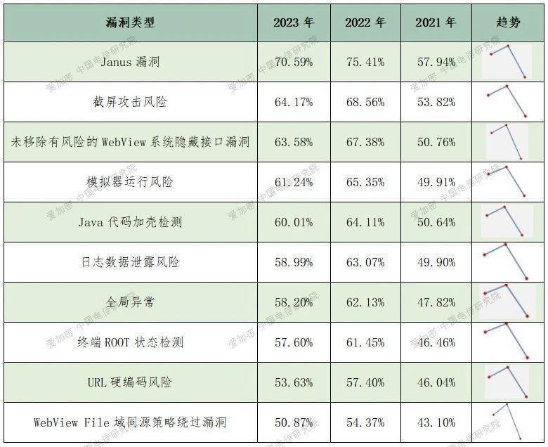 移动应用大数据平台利用安全检测引擎对有更新的应用,进行 140 项漏洞扫描。检查结果显示:有高达 76.89% 的应用被识别为高危应用。这个比例相比于过去两年有了 2.02% 的小幅增长。数据表明,尽管我们在技术和安全措施上有所进步,但高危漏洞在移动互联网应用中的存在仍然是一个严重的问题,因为它意味着我们的个人信息、财务信息和其他重要数据可能会因为这些漏洞而受到威胁。