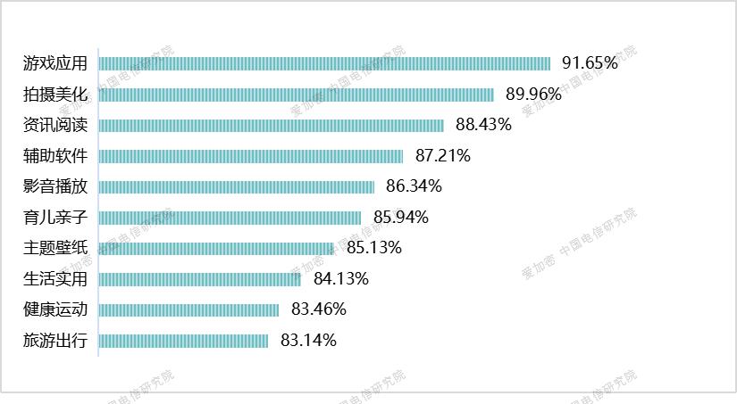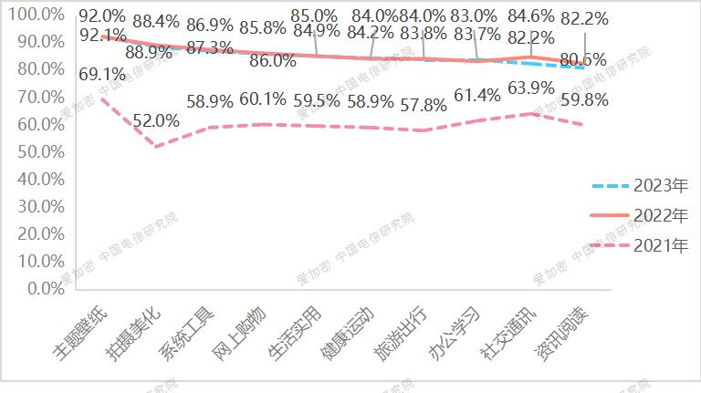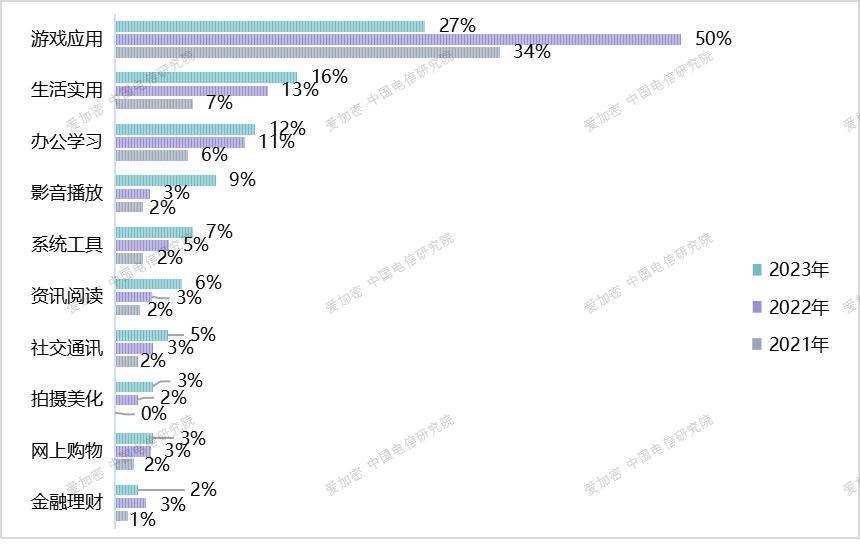 截至到 2023 年 12 月 31 日,全国活跃应用总计 7 万款。从功能类型来看,游戏类应用活跃度较高,占全国活跃应用总量的 27%,位居第一,近三年对比,游戏应用远低于以往两年;生活实用类应用数量占全国活跃应用的 16%,位居第二;办公学习类应用数量占全国活跃应用的 12%,位居第三。