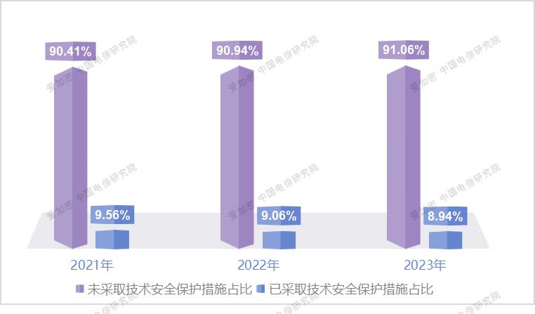 对全国移动应用中未采取技术安全保护措施的应用(即未加固应用)情况进行统计,已采取技术安全保护措施的应用总计 40 万款,占 8.94%,未采取技术安全保护措施的应用占总量的 91.06%。应用如果不进行技术安全保护措施会无法确保应用安全,无法防止被破解、二次打包、恶意篡改等。近三年未采取技术安全保护措施的应用占比变化如下: