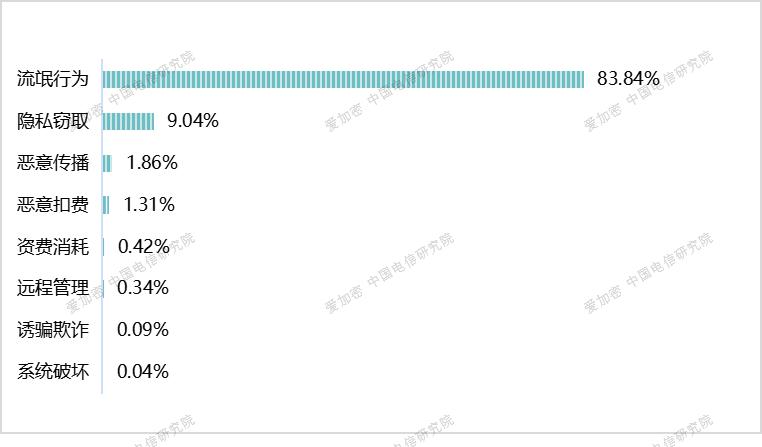 截至 2023 年 12 月,全国累计含有恶意程序的应用 29 万款,其中恶意程序类型以 " 流氓行为 " 为主,这些恶意程序主要存在对移动用户的隐私数据收集、恶意扣费、流量资源消耗、系统破坏和广告推送等多种恶意行为,对移动用户的个人信息及财产安全带来巨大的威胁。详见下图: