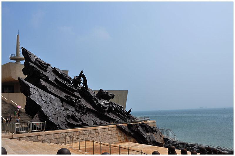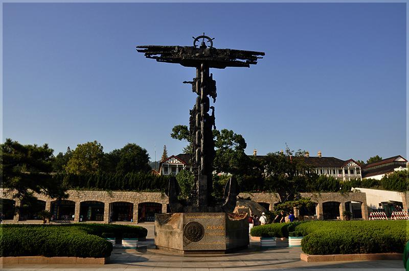 远处巨大邓世昌雕塑屹立在海边,那就是甲午战争博物馆,在那里记录着中国近代史上一段屈辱的历史。经过大约半小时的航行我们停靠在了刘公岛的码头。