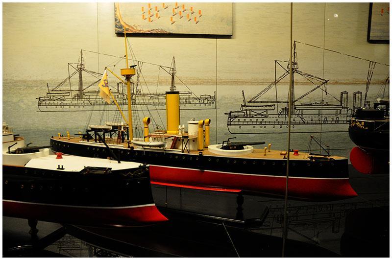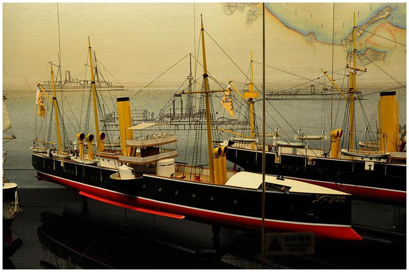 第一个展厅主要展示了北洋水师的各型战舰模型,购置时还是当时世界最先进技术的战舰,尤其是定远和镇远两艘装甲战列舰。这两艘战舰的加入曾使中日战争推迟了十年,但最终战争还是爆发了,而这时它们都已经落后了。