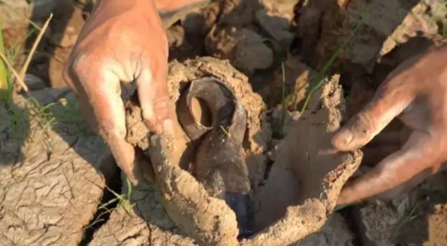 人们为了挖出更多这种生长在土里的非洲肺鱼,开始总结经验,它们发现,非洲肺鱼之所以能在地下生存那么久,是因为聪明的非洲肺鱼会留下一个小孔,用来实现地底的通气,所以人们可以通过这个“记号”找到肺鱼。