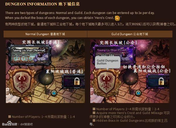 有两种类型的地下城,普通地下城和工会地下城。每个地下城每天最多可以进入3次。消灭BOSS以后可以获得[神兽之印]。