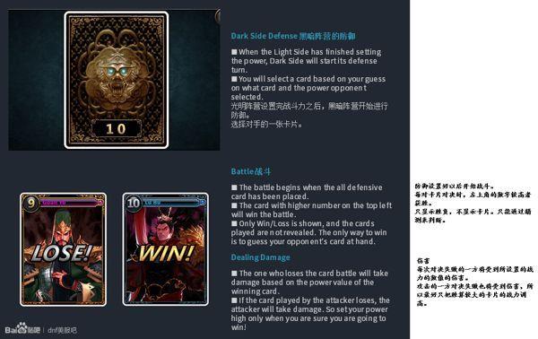 战斗:防御设置好以后开始战斗。每对卡片对决时,左上角的数字较高者获胜。只显示胜负,不显示卡片。只能通过猜测来判断。