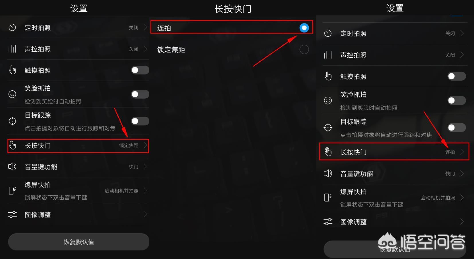 1、谈到手机连拍功能,我相信很多朋友肯定都还不知道连拍怎么打开,如何设置。如下图,在相机的设置菜单中,向下滑动菜单,找到长按快门那一栏如下图最左边的图片,然后点开工具,将锁定焦距切换到连拍,如下图中间的图片。设置好后点击手机的返回键,如下最右边的图片,现在设置信息里的参数长按快门就是连拍效果了。