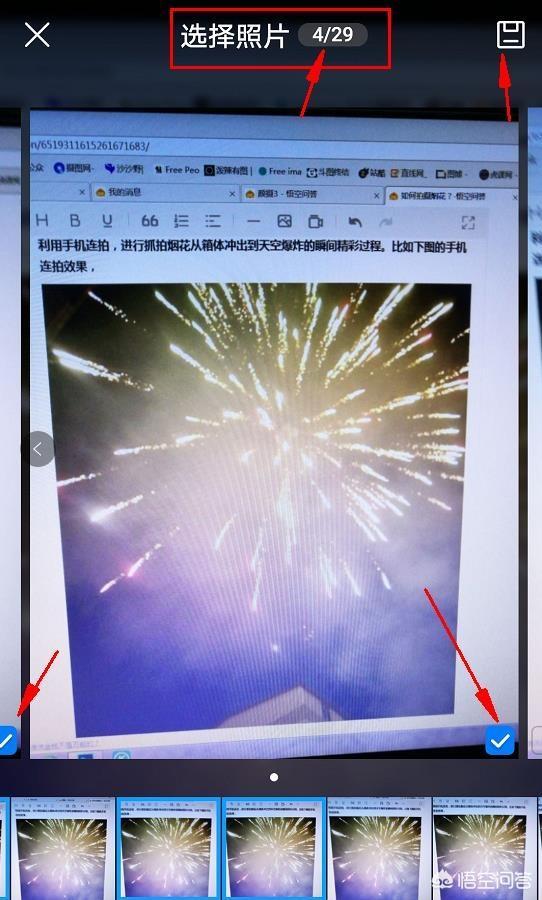 4、点击图片后,如下图,一个拍摄了29张图片的连拍效果。注意:此图应该不是前两步数字只有13的那张图片,在选择好我们想要的图片后,点击右上方的保存按钮即可对图片进行保存,保存到新的图片,保存路径还是在相机相册里面,而且源文件图片也不会被清除,只要我们不进行删除都会一直保存的。