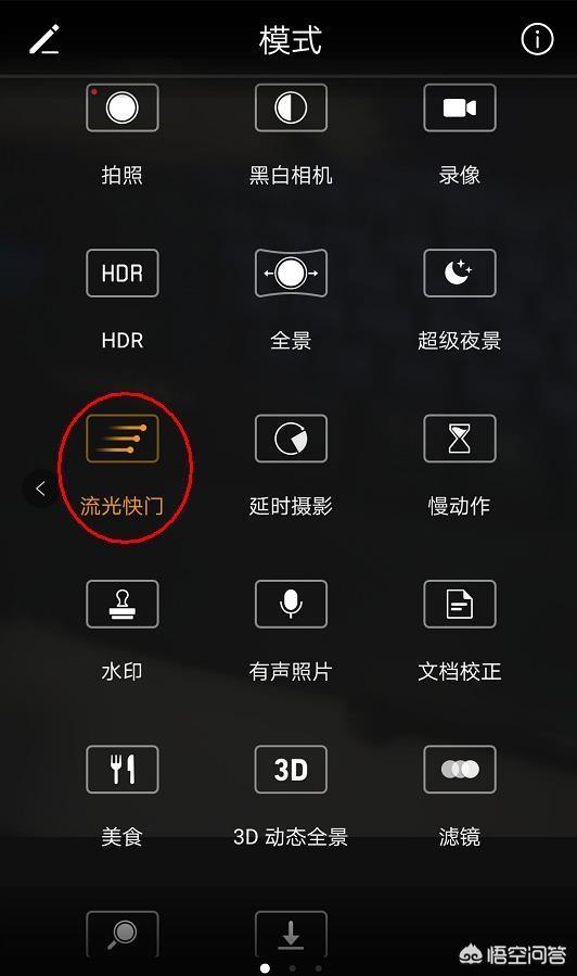 1、滑动手机设置菜单,找到拍摄模式菜单,找到流光快门效果进行拍摄。