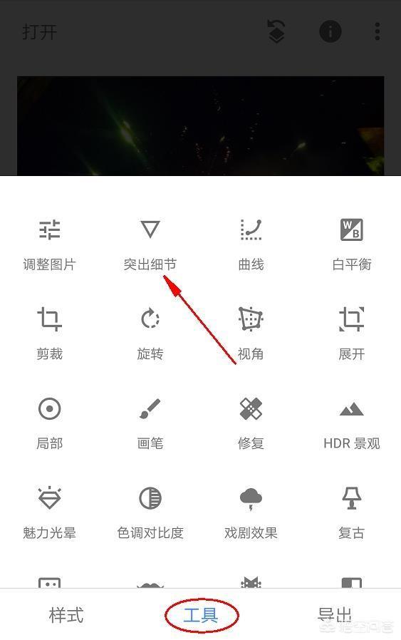 ④、在选择好样式后,由于手机拍出来的图片都不够锐利,所以我们这里简单为图片添加一些细节,让图片更锐利,画质更好。点击工具栏,选择突出细节工具,然后点开进行编辑。