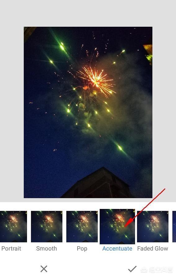 ⑤、进入调整细节工具后,手指在图片上左右滑动,即可对当前参数进行加减调整,手指上下滑动,即可切换调整参数,然后再左右滑动进行调节参数。也可以点击下方绿色箭头指的按钮,这样就可以看到所有调整工具的参数详情了。根据自己的图片去调整合理的参数,调图片需要感觉,自己觉得好才是真的好,在平时的生活中多仔细观察,慢慢提升自己的摄影眼及欣赏能力。调整好后就点击右下方的√即可保存效果。