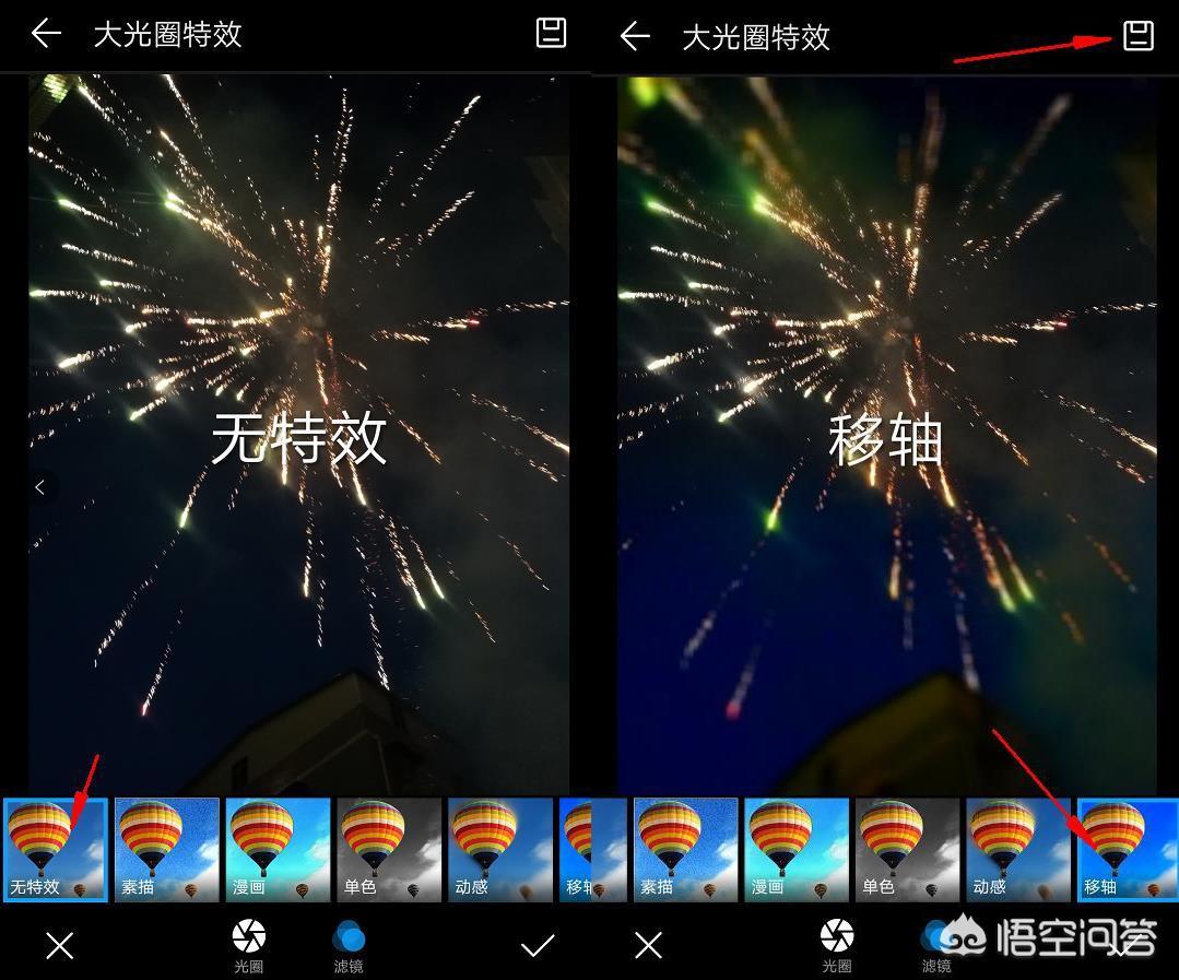 点击滤镜模式,刚进入滤镜模式时无任何效果,如下右边的图片,选择了一个移轴效果滤镜,图片色彩一下就出来了,非常漂亮。(注意:本次演示时使用的是华为P9手机,大部分手机应该都有这个功能,只是位置以及表现形式不一样,需要大家认真找找)