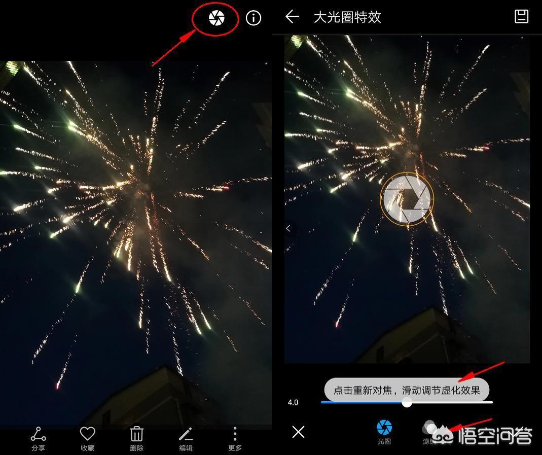 首先在本地相册里找到我们需要处理的图片,然后点击右上角的大光圈图标。注意:前期用大光圈模式拍摄的图片才有这个图标哦,可以进行二次对焦,以及添加一些拍摄时简单的镜头滤镜效果。如下图,点击大光圈按钮, 然后进入进行编辑。