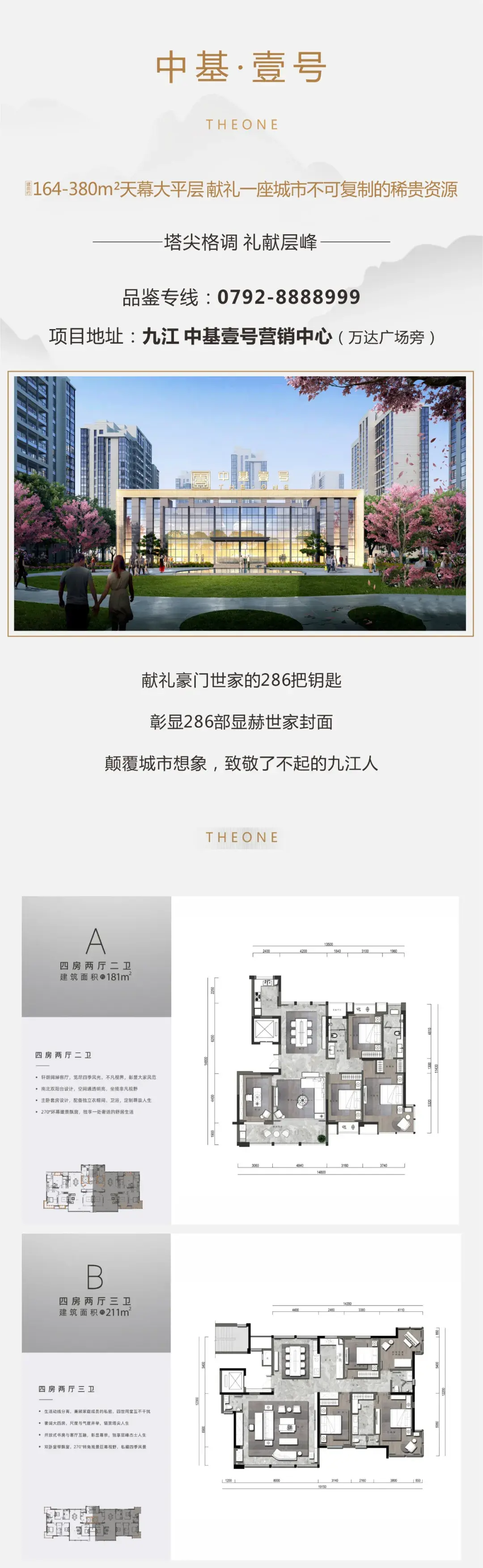 温馨提示:本项目推广名为“中基壹号”。本宣传资料仅为要约邀请,在建设过程中可能因政府强制性要求而修改,同时,在不违反法规、不违反合同约定的前提下,九江中基房地产开发有限公司亦有权做出细部调整。项目周围环境、交通及其他公共设施的介绍,旨在提供相关信息,不意味着本公司对此作出了承诺。本资料图片是对项目所做示意,仅供参考,部分图片来源自网络,九江中基房地产开发有限公司保留宣传资料修改的权利,本资料有效期至2021年3月,敬请留意最新资料。九售许字(2020)第227号