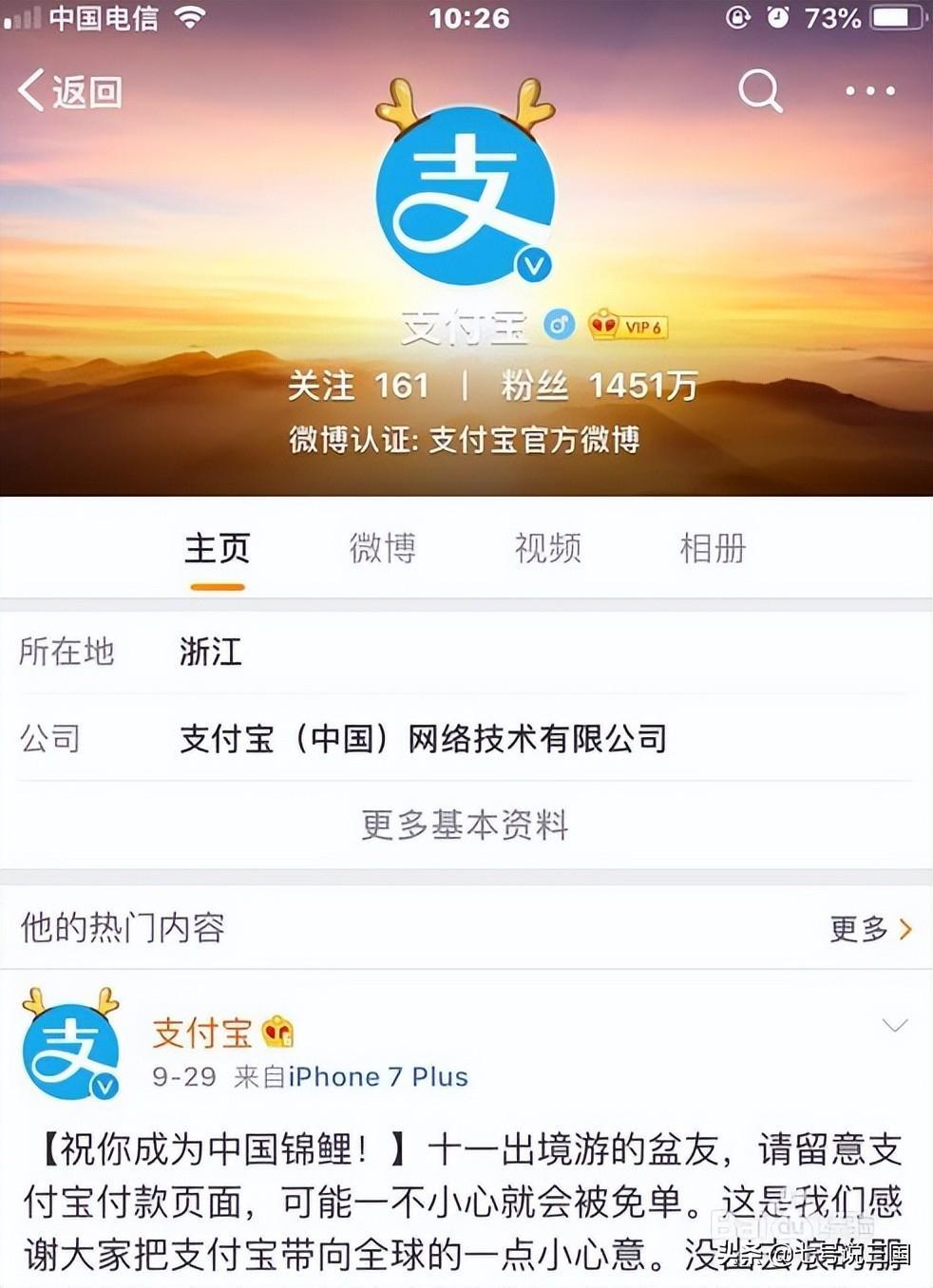 2018年9月29日,为了庆祝国庆,支付宝在微博上写道:“十一出境游的盆友,请留意支付宝付款页面,可能一不小心就会被免单。”支付宝会在转发这条微博的朋友中,找出一位“集完全宠爱于一身”的中国锦鲤,将获得鞋包服饰、化妆品、美食券、机票等在内的各类奖品。