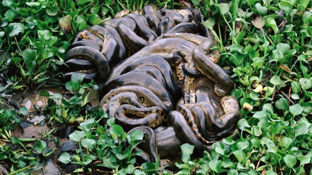 森蚺的交配是最让人震撼的,它和其他的动物是不一样的,在归亚纳热带平原,每年旱季结束的时候正是森蚺交配的季节,雌森蚺整整一天都释放着强烈的荷尔蒙,吸引雄蛇从远处赶来,吸引来的十几条或上百条雄蛇和一条巨大的雌蛇紧紧缠绕在一起,它们的缠绕形成一个球形,这个缠绕的社团将会保持几天甚至几个星期,在缠绵的拥抱中,哪条雄蛇得以与雌蛇交配是无法预知的,这种震撼人心的舞蹈只有在森蚺交配的时候才可以看到。