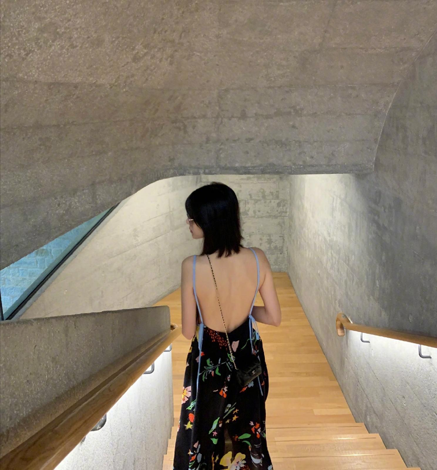 这张照片上的李溪芮只露出她绝美的背影,这是对自己的身材相当有信心啊,并且她的短发正好没有遮住她好看的背部,看来蝴蝶背确实名不虚传呀,吊带的颜色和裙子上的颜色完全不同,是淡淡的蓝色,而黑色连衣裙的色彩和风格非常适合去夏威夷海边度假,色彩斑斓的图案在黑色的裙子上非常吸人眼球,再加上无可挑剔的身材,美就一个字,我只说一次!