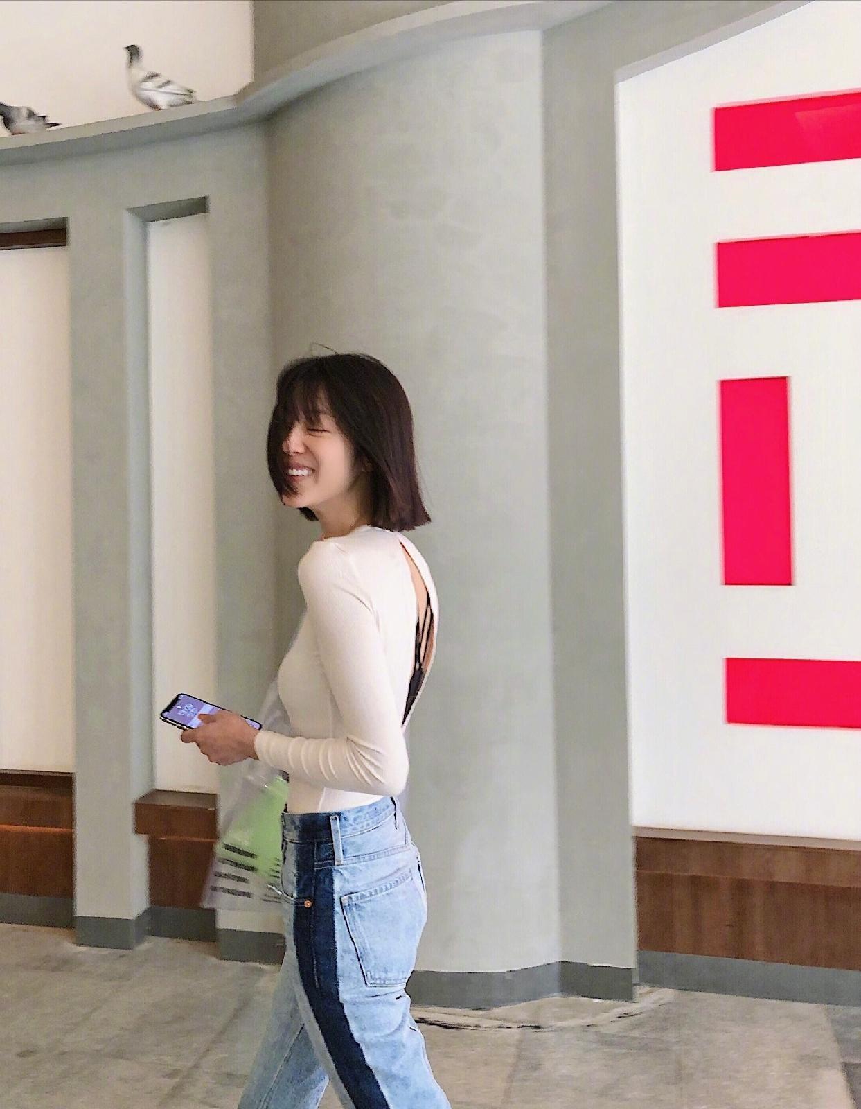 李溪芮是个很爱笑的女孩呢,修身的上衣把她瘦瘦的肩膀,纤细的小手臂显示出来,最“心机”的细节是上衣背后有开叉的设计,里面的黑色吊带内搭性感的刚刚好,再说说这条牛仔裤吧,主色是浅色系的淡蓝色,和上身的杏色上衣很配哦~侧面的一条边用了深色系的颜色,看上去就很不一样呢。