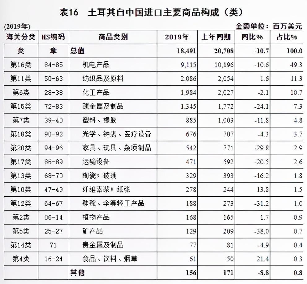 2019年,这三类产品合计进口131.9亿美元,占土耳其自中国进口总额的71.3%,其中仅机电产品就占土耳其自中国进口产品的近一半。