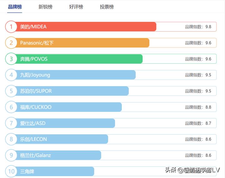 上榜理由:全球知名豆浆品牌,中国知名厨房电器品牌,也是豆浆机行业的领跑者,并致力于 电饭煲 、 榨汁机 、 料理机 、 面条机 等适合中国人的产品。九阳始终鼓励消费者向家人表达爱,亲手做一杯豆浆或者一顿晚餐,是对家人最好的呵护与关爱。2018年杨幂代言九阳豆浆机,幂制豆浆,喝出美丽。 9.5 品牌指数