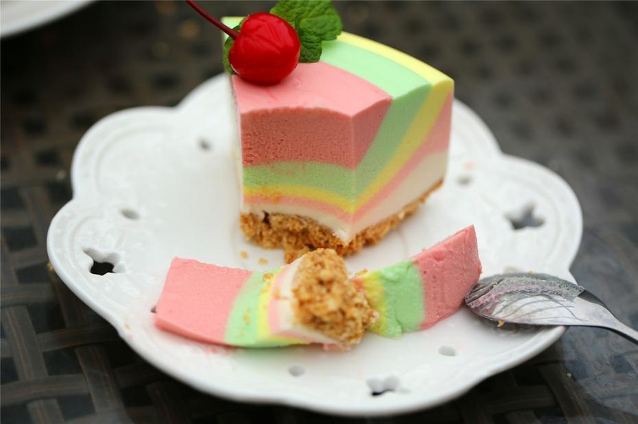 这个是彩虹慕斯蛋糕,基本都是慕斯,喜欢吃很多慕斯的有福了,它的整个色泽除了表面内部也是这样的额,显得特别好看,而且偷偷告诉大家,这款蛋糕真的很好吃哦,我每次吃完都感觉没吃够!~~~~(>_<)~~~~