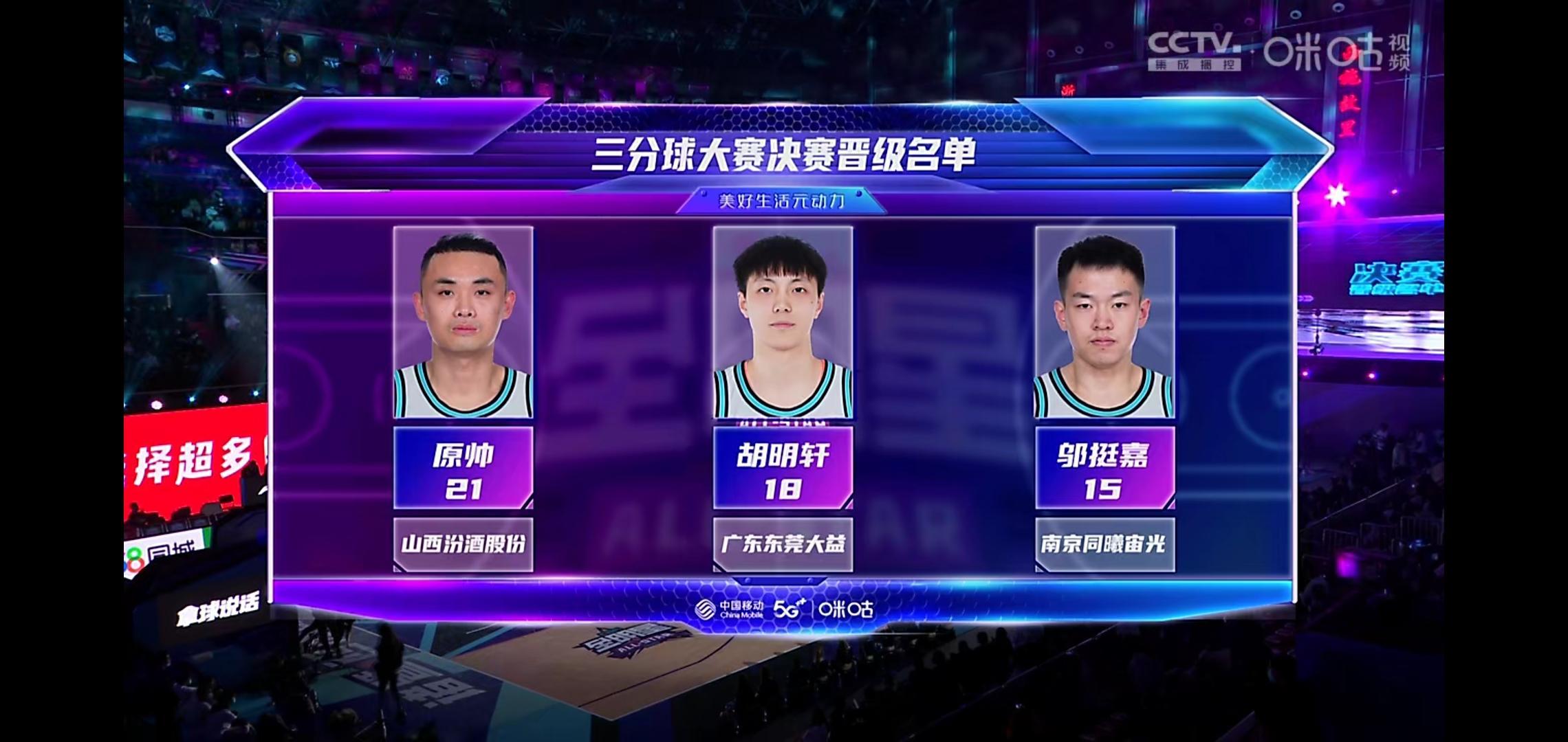前三名会进入明天举行的决赛,原帅和胡明轩直接晋级,刘家昕和邬挺嘉分数相同,需要加赛一轮决出胜者,第二轮邬挺嘉发会更好,成为了最后一个晋级的球员。这份名单其实挺让人意外的,因为胡明轩本赛季投篮状态并不好,仅仅只有28.1%,然而他却充满自信,投出了第二好的成绩。其他只有10分左右的球员看看自己的分数,参加三分大赛尴不尴尬。