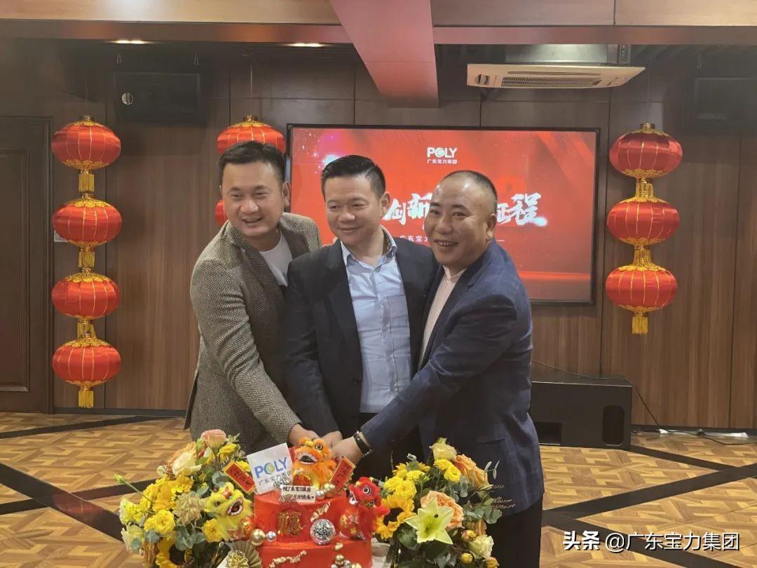 广东宝力集团董事长孙少超、宝力控股集团董事长任德华、广东广佛慧谷有限公司总裁郭冠程一同切蛋糕,共祝广东宝力集团成立八周年生日快乐!