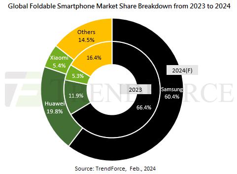 IDC 之前发布过一份报告,指出 2023 年全年中国折叠屏手机市场出货量约 700.7 万台,同比增长 114.5%,也是连续第四年同比增速超过 100%。TrendForce 对 2023 年全球折叠屏手机市场的预估是 1590 万台,同比增长 25%。