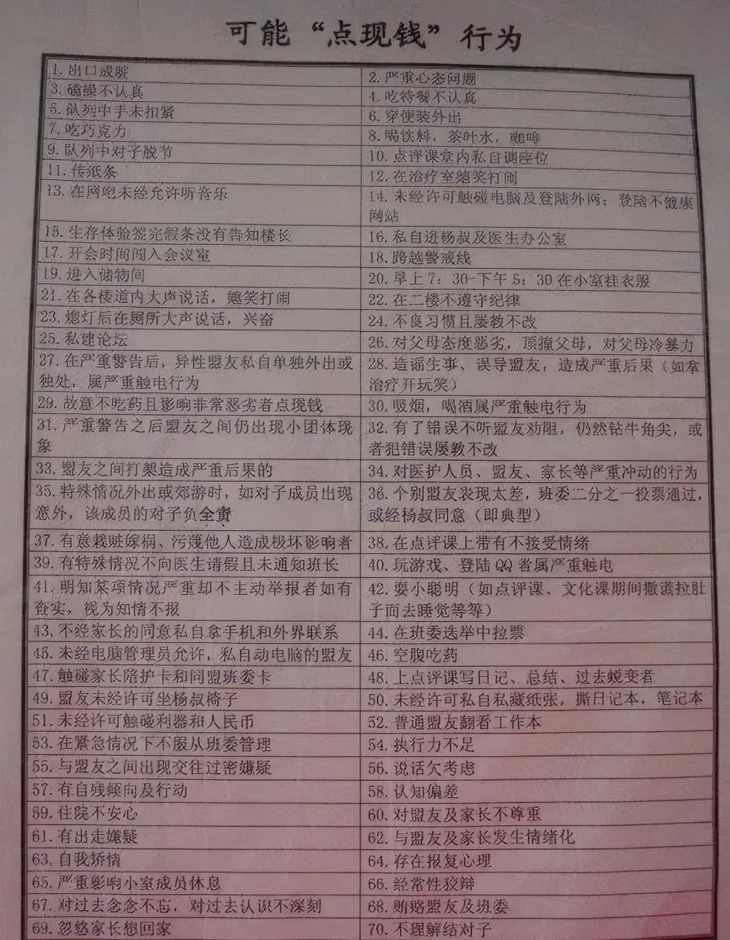 为了能够更好地让孩子们屈服于自己,杨永信还特地制定了一整套的惩罚方案,并将其称之为了“点现钱”。