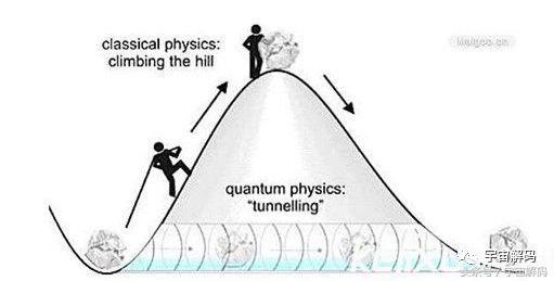 (注:1. classical physics: climbing the hill,经典物理爬山坡;2. quantum physics: "tunneling"static limit,量子物理穿隧道。)