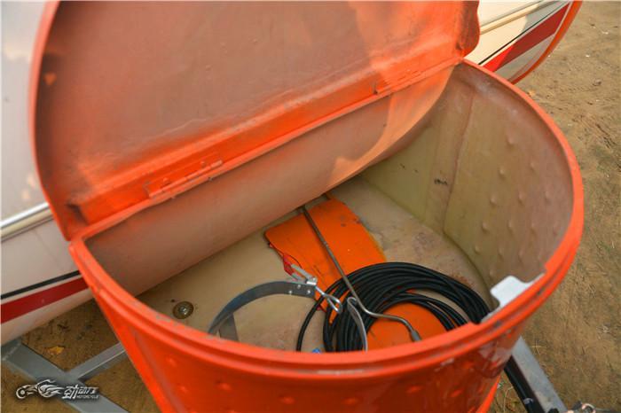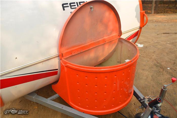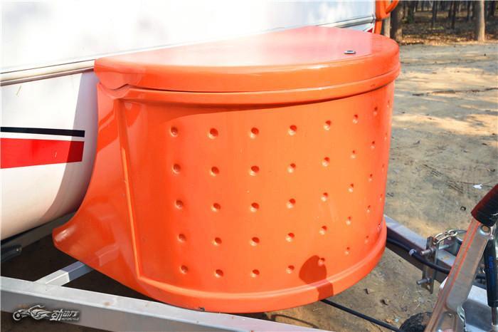 在房车前部有个很显眼的箱子,里面预留了小型煤气罐的固定支架,还可以放一些工具之类的杂物。