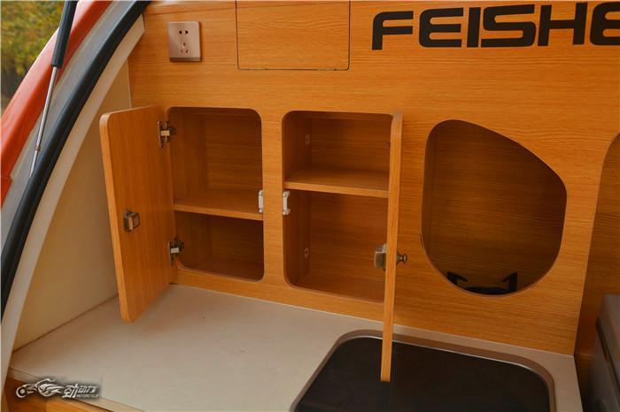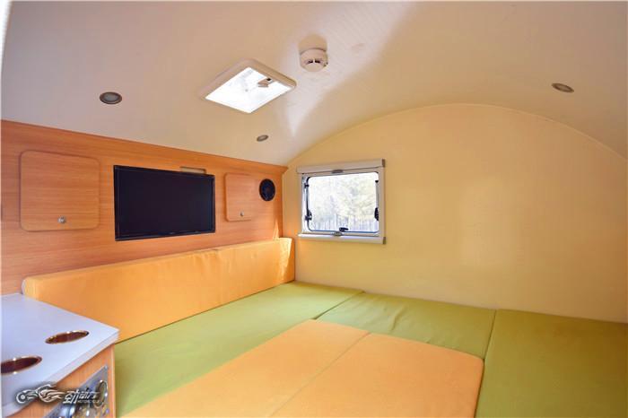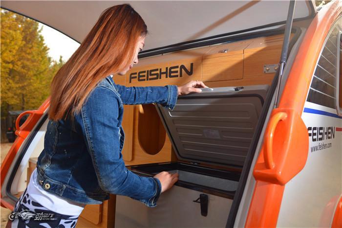 飞神水滴拖挂式房车外形小巧、圆润,如同水滴一般。车身长宽高为:4360*2070*2100,一般家用轿车就可轻松拖动。“水滴”的底盘材质为冲压钢板与钢管,采用镀锌钣金冲压钢板焊接工艺,配备了规格为165R13C的高速轮胎,不仅拥有较高的行驶稳定性,还能保证不错的底盘强度。