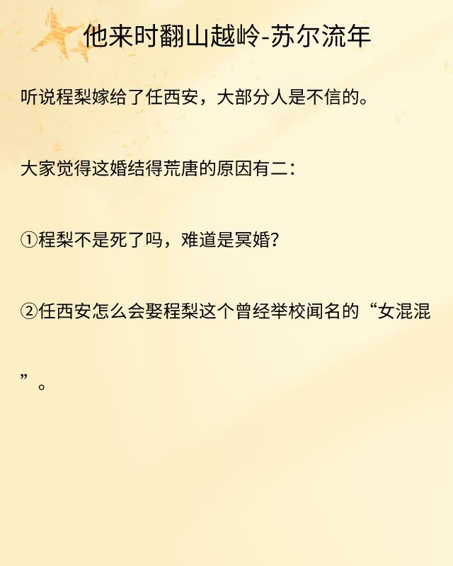 在这个故事里,程梨一直是主动的那个且决定着两人爱情走向的那个人,两人重逢后,即使任西安有意冷落她,但心总是不由自主地偏向她,自然后来两人久别重逢,破镜重圆了。