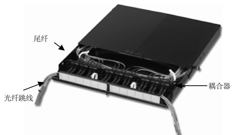 将光缆的每个芯都与一根尾纤熔接在一起,并做好标记。然后,再借助固定于光缆配线架或信息插座上的光纤耦合器,提供各种类型的光纤端口。图5-12所示为连接至光缆配线架。图5-13所示为连接至信息插座。