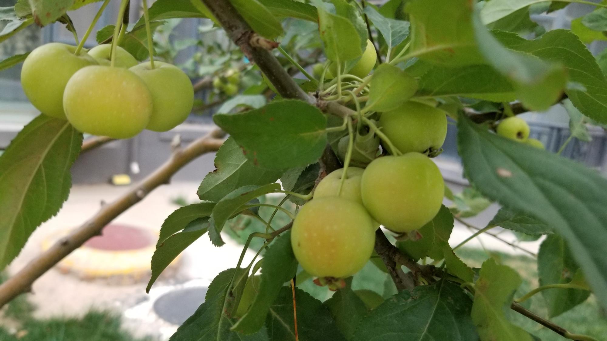 西府海棠果实近球形,稍大,直径1-1.5公分,成熟后红色,萼片宿存或部分脱落;成熟稍早,八月前后成熟,可以食用。